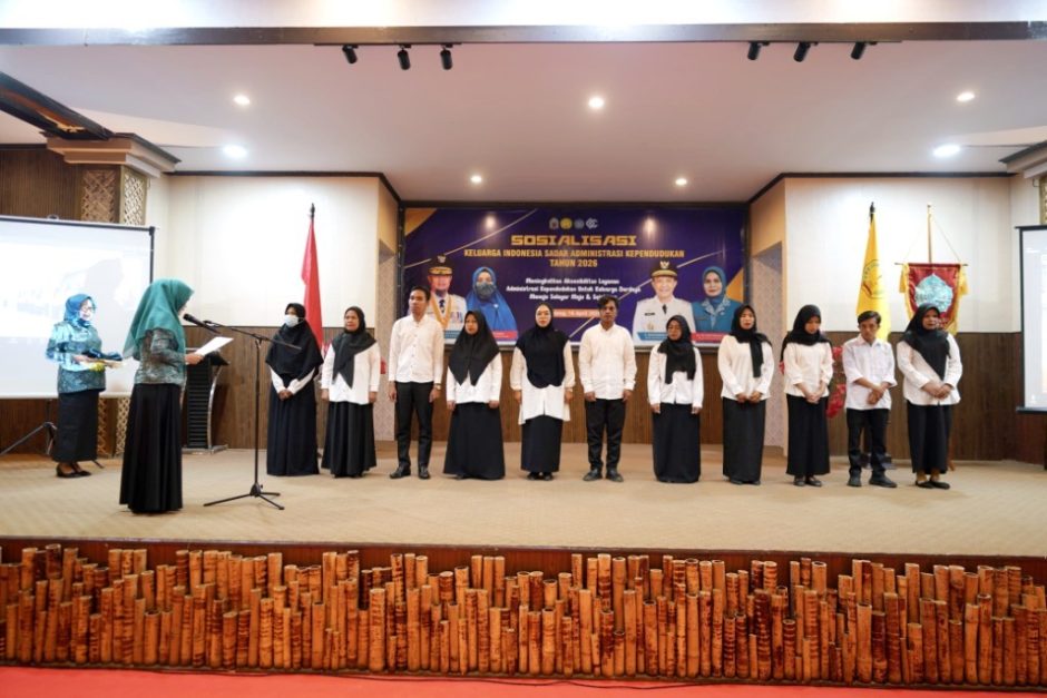 Pengukuhan tersebut ditandai dengan pemasangan selempang dan pin kepada para duta KISAK sebagai simbol amanah dan komitmen dalam mengedukasi masyarakat terkait pentingnya administrasi kependudukan.